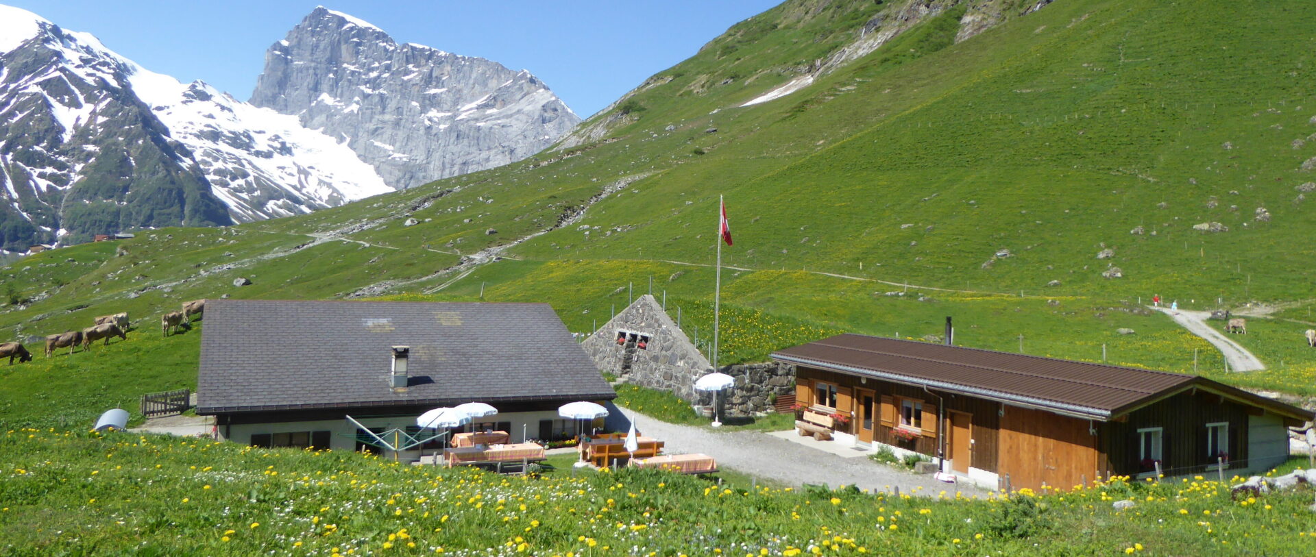 Die Alp Hobiel liegt auf einer sonnigen Terrasse hoch über dem Tal. Von hier aus öffnet sich der Blick auf Titlis, Schlossberg sowie Gross und Klein Spannort.