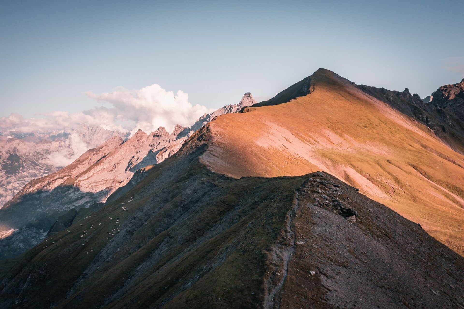 Von der sonnigen Bergterrasse führen Wanderwege durch weite Alpweiden und alpine Landschaften Richtung Surenenpass, Spannort und Urner Alpen.