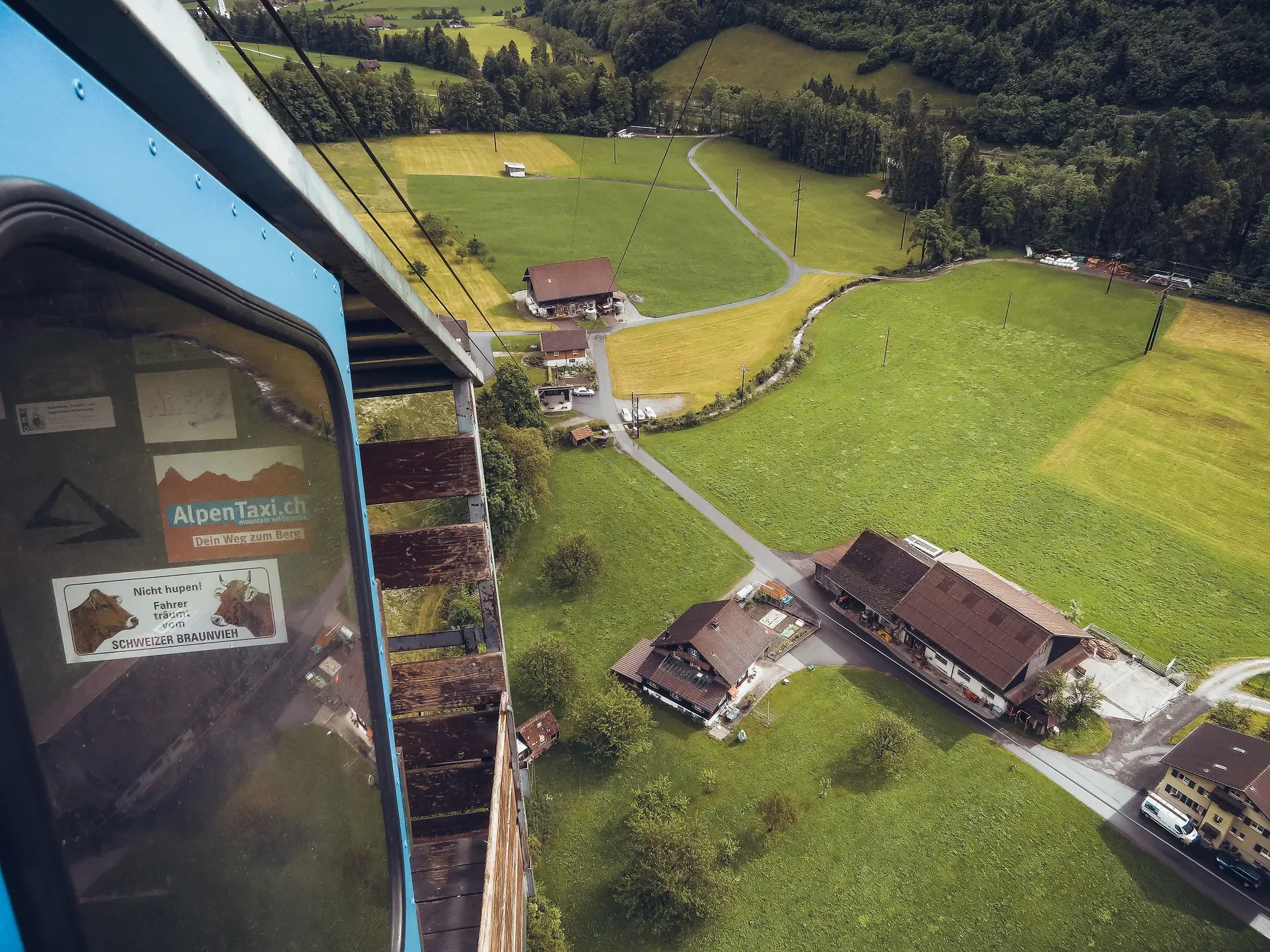Anders als bei vielen Bahnen hängen die Gondeln vorne und hinten aufgehängt – dadurch „kippt“ die Kabine je nach Steigung spürbar nach vorne oder hinten.
