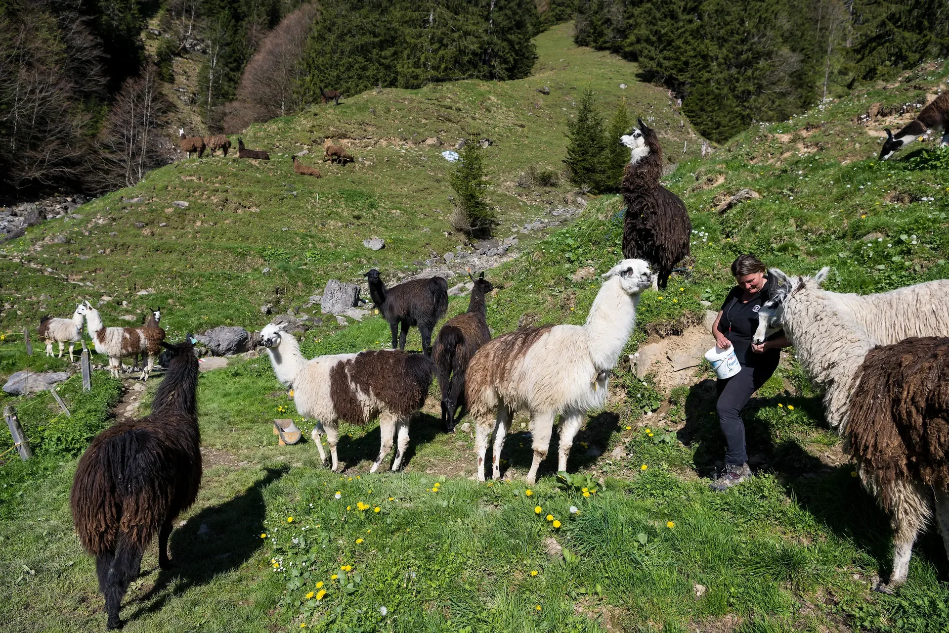 Zur Bielen gehören nicht nur steile Wiesen und echte Alparbeit, sondern auch Lamas und Alpakas, die den Sommer auf der Alp Bödmen verbringen.